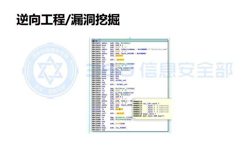 拿到文件之后,就开始进行漏洞挖掘。Chu老师先介绍了与传统漏洞挖掘有哪些区别。首先是架构体系不同,《逆向工程核心原理》一书中就介绍了很多架构,值得一看。保护措施方面相比于其他,IoT方向的特点则是没有保护措施,并以常见漏洞类型为例进行了讲解。