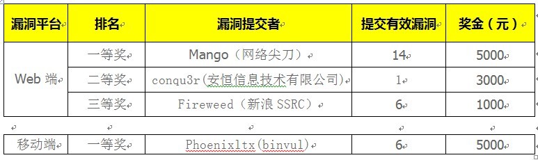 本次颁发的“月度突出贡献”奖励,与其原有的漏洞奖励方案并不冲突,共有4位表现突出的白帽子拿走了1.4万元月度奖金。